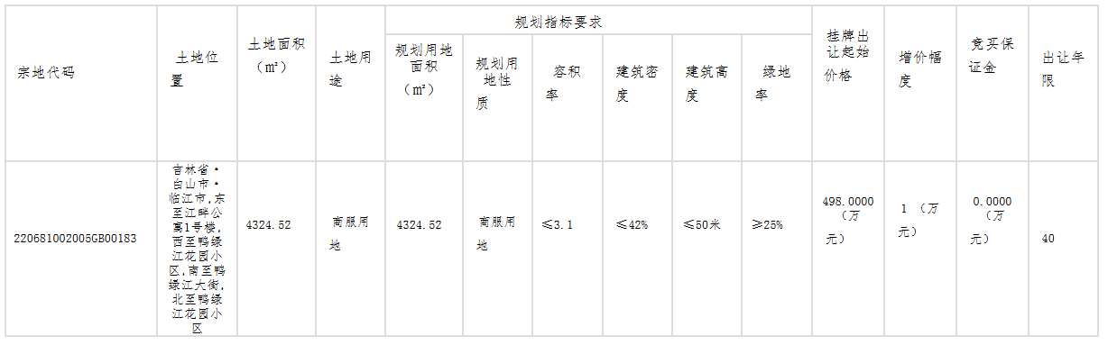 经临江市人民政府批准,临江市自然资源和林业局决定以 挂牌 方式出让 1(幅) 地块的国有土地使用权。现将有关事项公告如下: