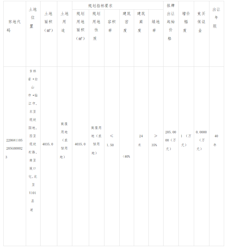 本公告在中国土地市场网(www.landchina.com)、临江市政务公开网站(http://www.linjiang.gov.cn/sy/gsgg)、吉林省公共资源交易一体化平台网站同时发布。
