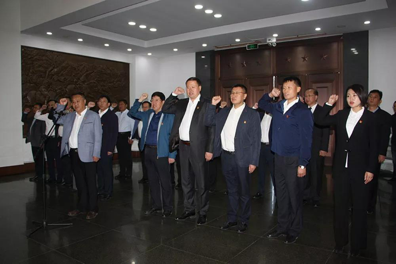 在鲜红的党旗下,参加活动的各位领导举起右手,庄严宣誓,重温入党誓词,市委书记钟铁鹏领誓。
