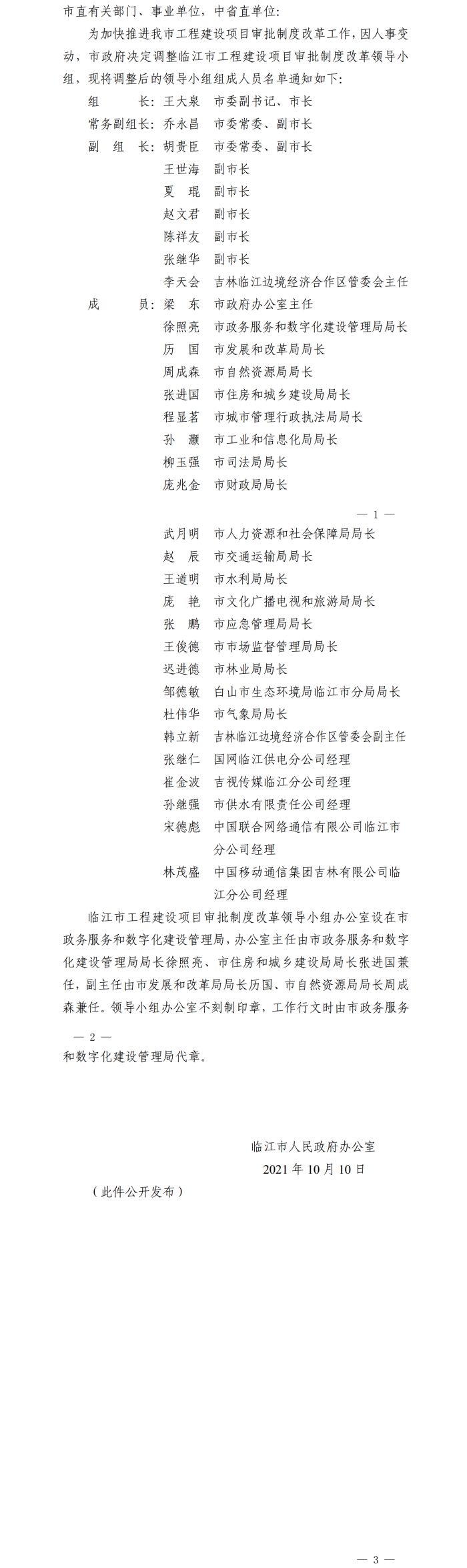 临江市人民政府办公室关于调整临江市工程建设项目审批制度改革领导小组的通知(临政办函〔2021〕31号)