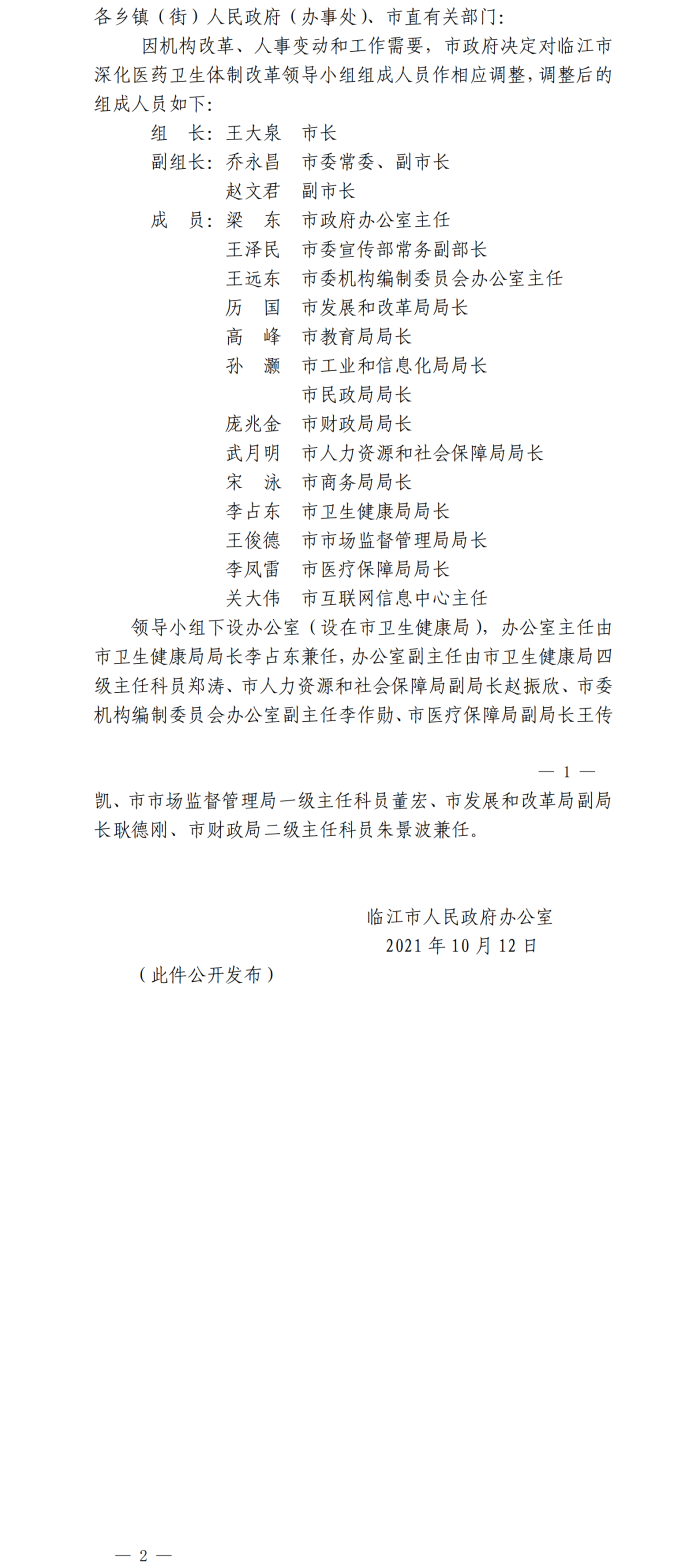临江市人民政府办公室关于调整临江市深化医药卫生体制改革领导小组的通知(临政办函〔2021〕32号)