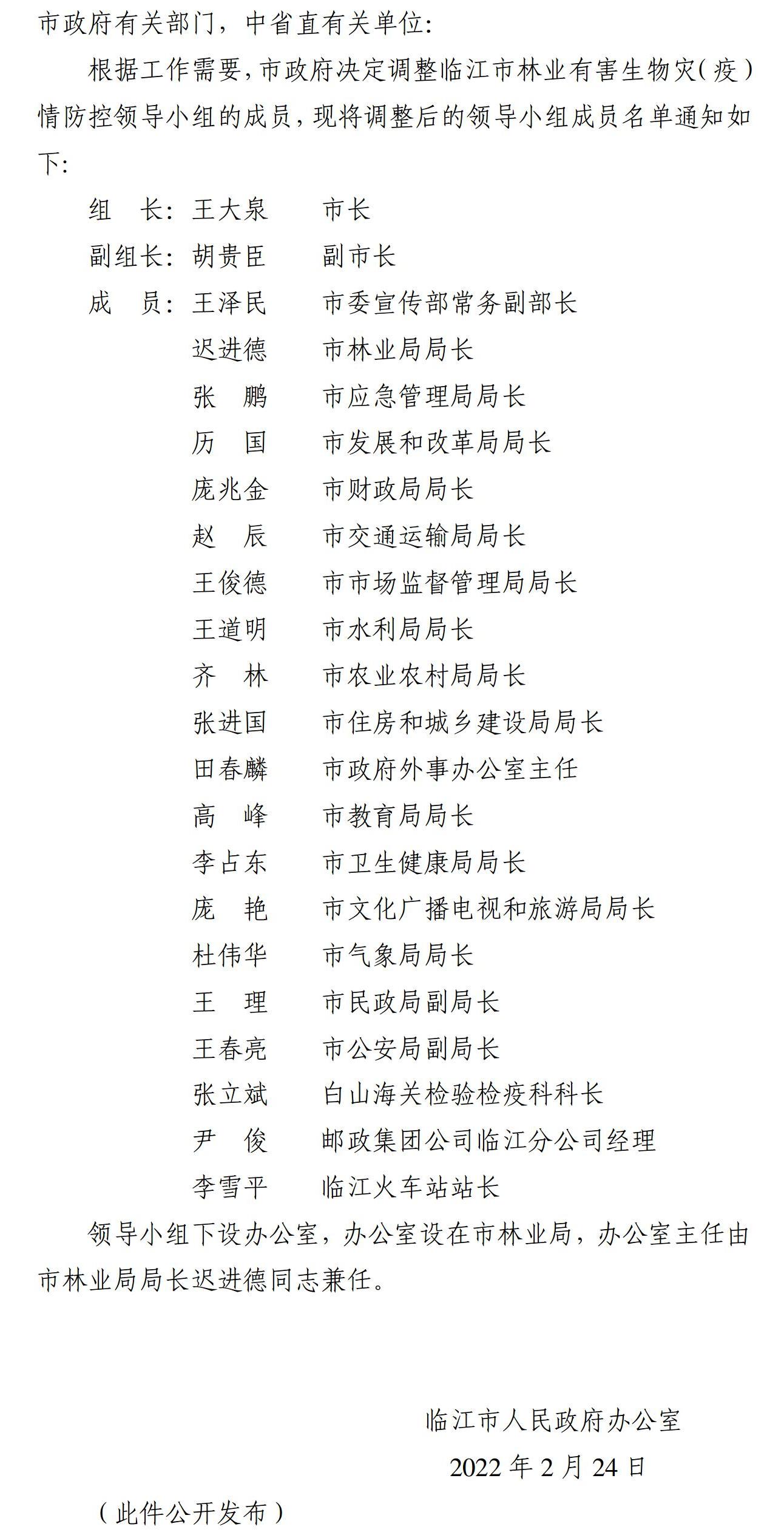 临江市人民政府办公室关于调整临江市林业有害生物灾(疫)情防控领导小组的通知 (临政办函〔2022〕5号)