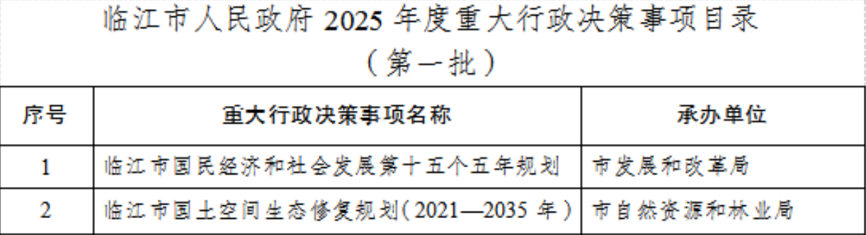 临江市人民政府办公室关于公布临江市人民政府2025年度重大行政决策事项目录(第一批)的通知(临政办函〔2025〕8号)
