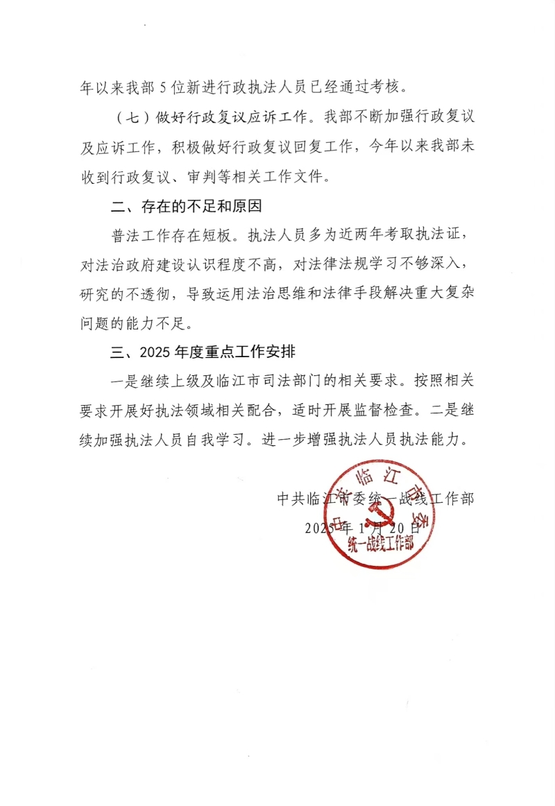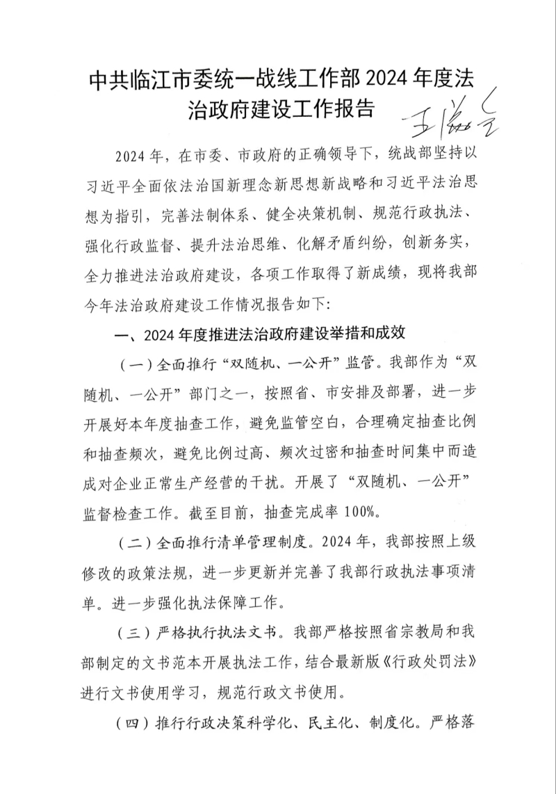 中共临江市委统一战线工作部2024年度法治政府建设工作报告