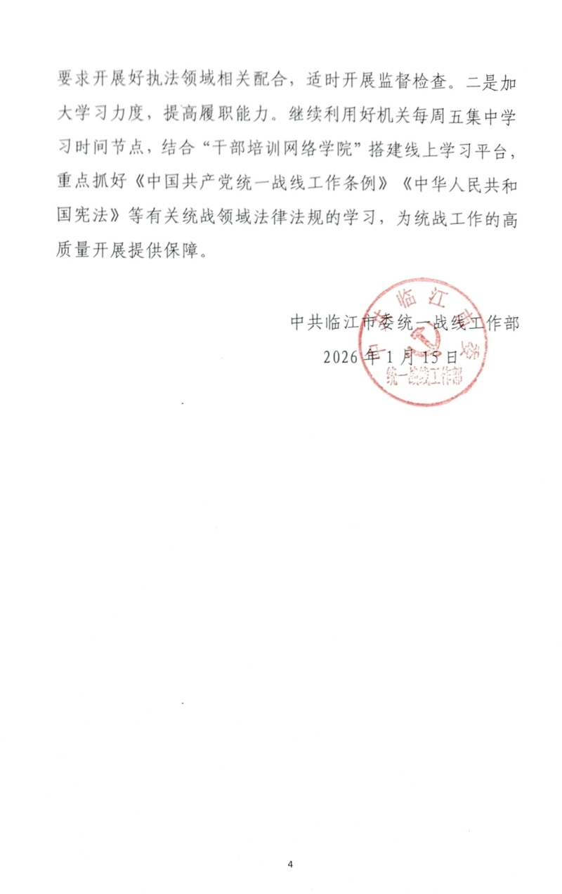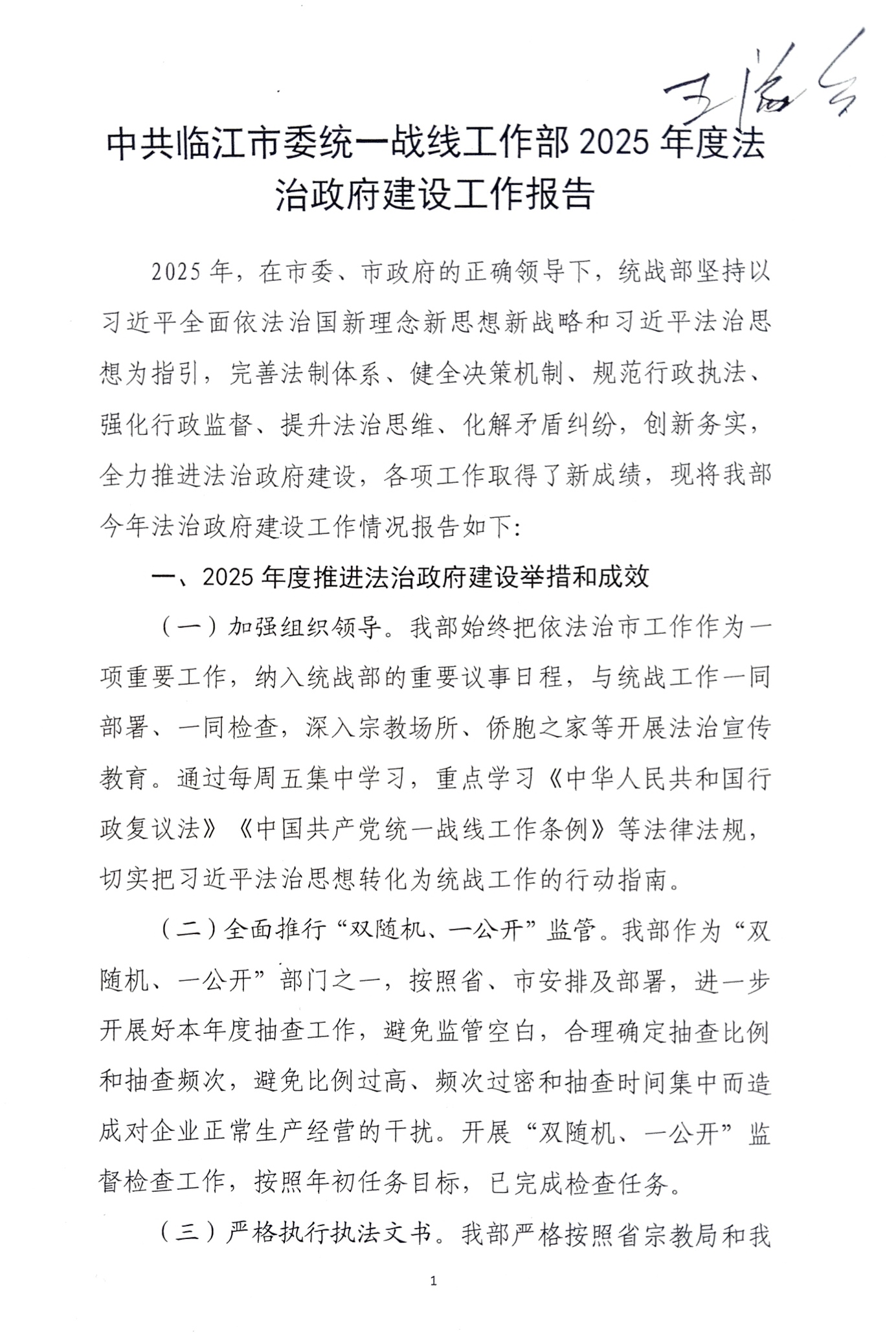 | 中共临江市委统一战线工作部2025年度法治政府建设工作报告 |